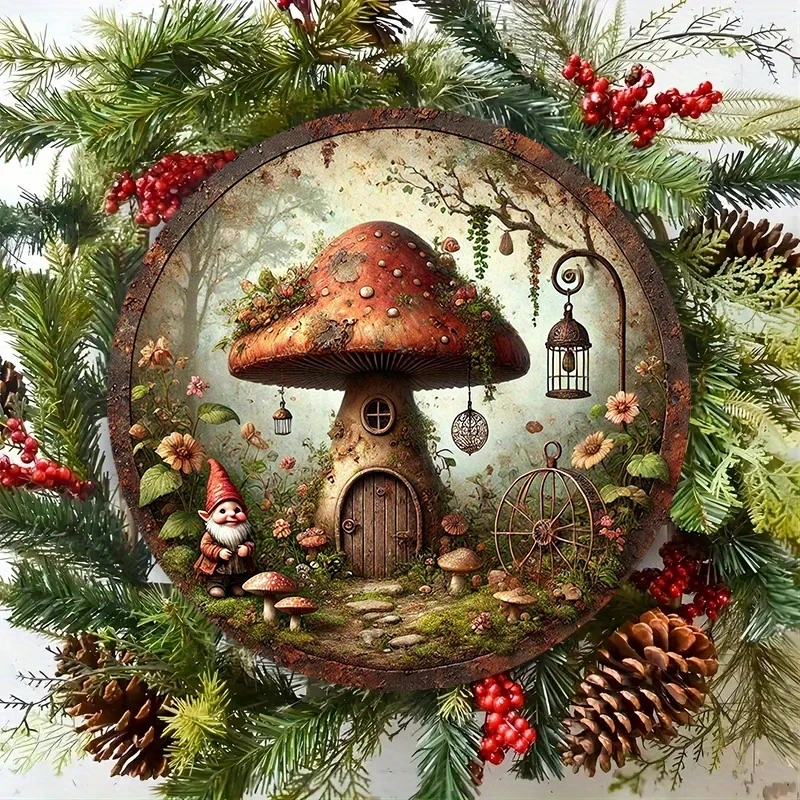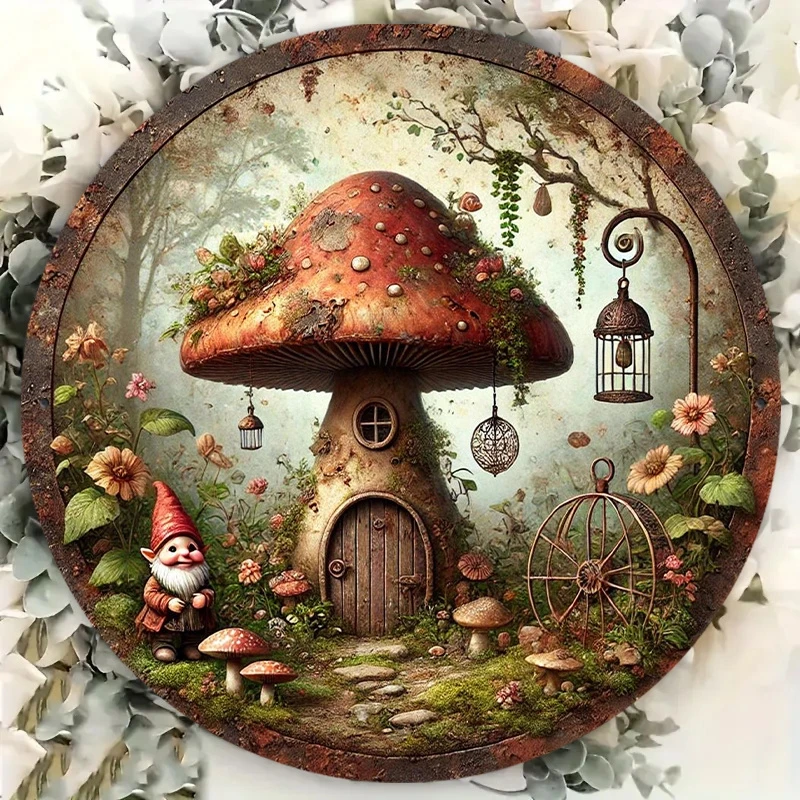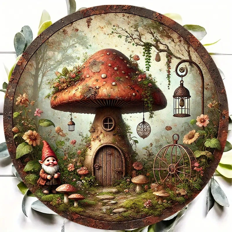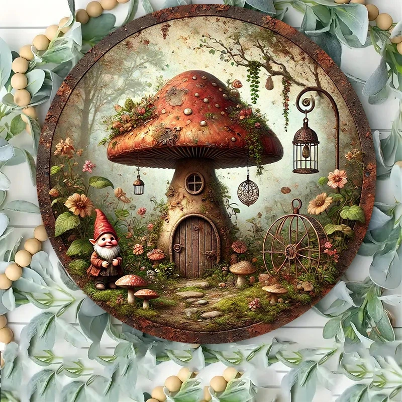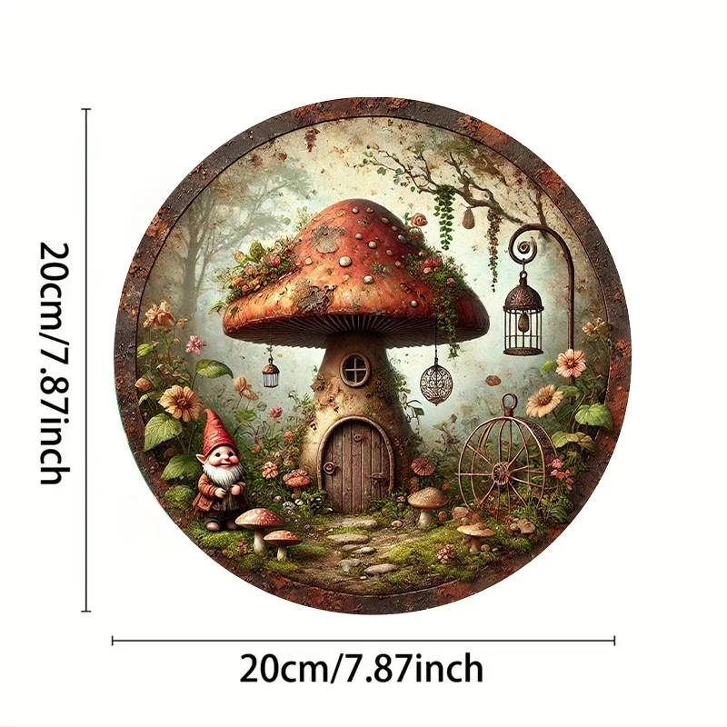 2D Retro Mushroom House Decorative 8in Wooden Disc Dreamy Forest Design Dwarf Old Man Bedroom Living Room Party Decoration Gift
