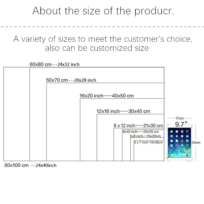 | Size (Inch) | A4 21x30cm No Frame, 30x42cm No Frame, 40x50cm No Frame, 50x70cm No Frame |